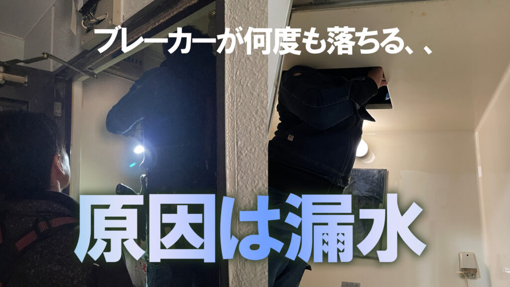 漏水の影響で配線が水に浸り、ブレーカーが落ちる状態が続いたことで、最終的に小ブレーカー自体が故障していました。